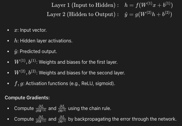 - Forward Pass: Compute the output of the network by passing inputs through each layer.
