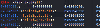 Observe how after loading the executable in GEF you can see the functions that are in the GOT: gef➤ x/20x 0xADDR_GOT