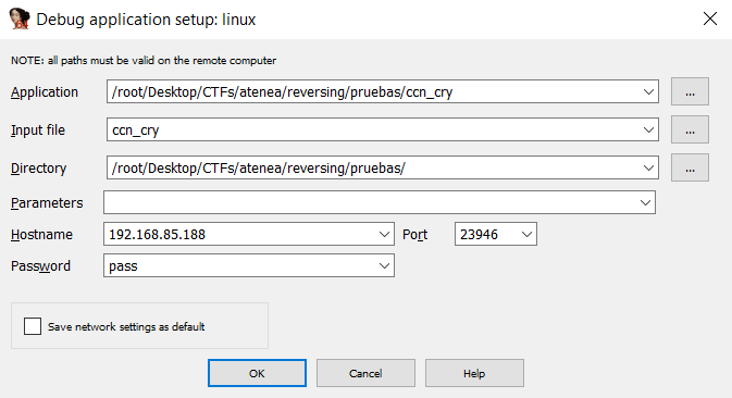 gdbserver --multi 0.0.0.0:23947 (in IDA you have to fill the absolute path of the executable in the Linux machine and in the Windows machine)