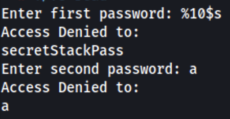 In the image it's possible to see that we can leak the password from the stack in the 10th position:
