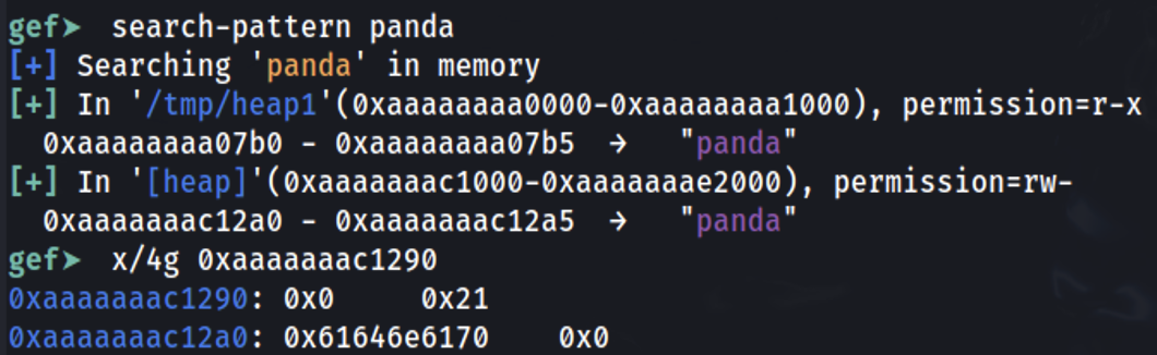 It's possible to see that the string panda was stored at 0xaaaaaaac12a0 (which was the address given as response by malloc inside x0). Checking 0x10 bytes before it's possible to see that the 0x0 represents that the previous chunk is not used (length 0) and that the length of this chunk is 0x21.