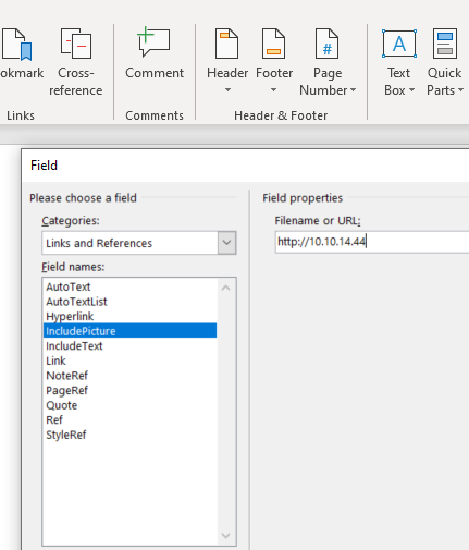 Categories: Links and References, Filed names: includePicture, and Filename or URL: http://<ip>/whatever