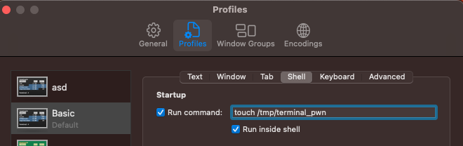 echo "touch /tmp/hacktricks" >> ~/.zshrc