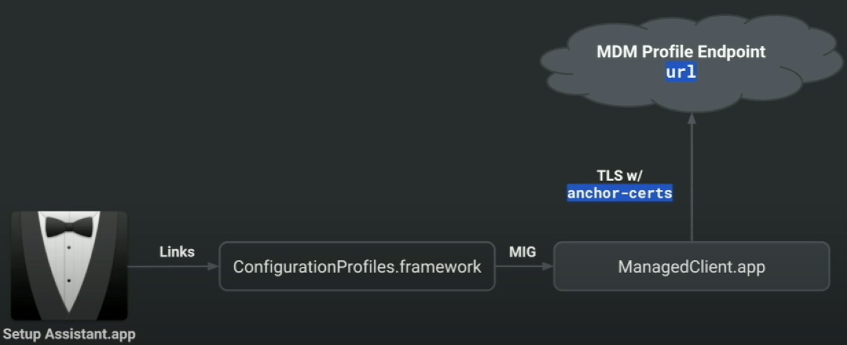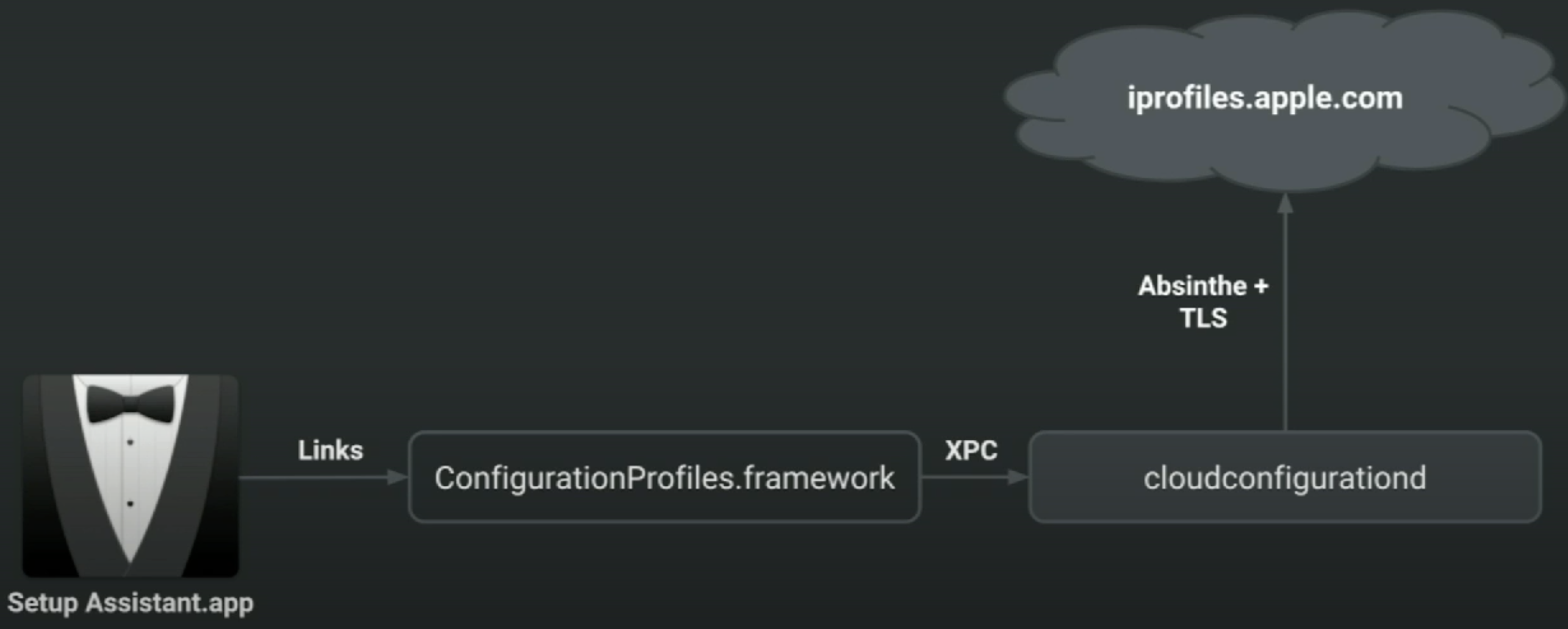 cloudconfigurationdvia XPC. The "Setup Assistant" (when the device is firstly booted) or theprofilescommand will contact this daemon to retrieve the activation record.- LaunchDaemon (always runs as root)