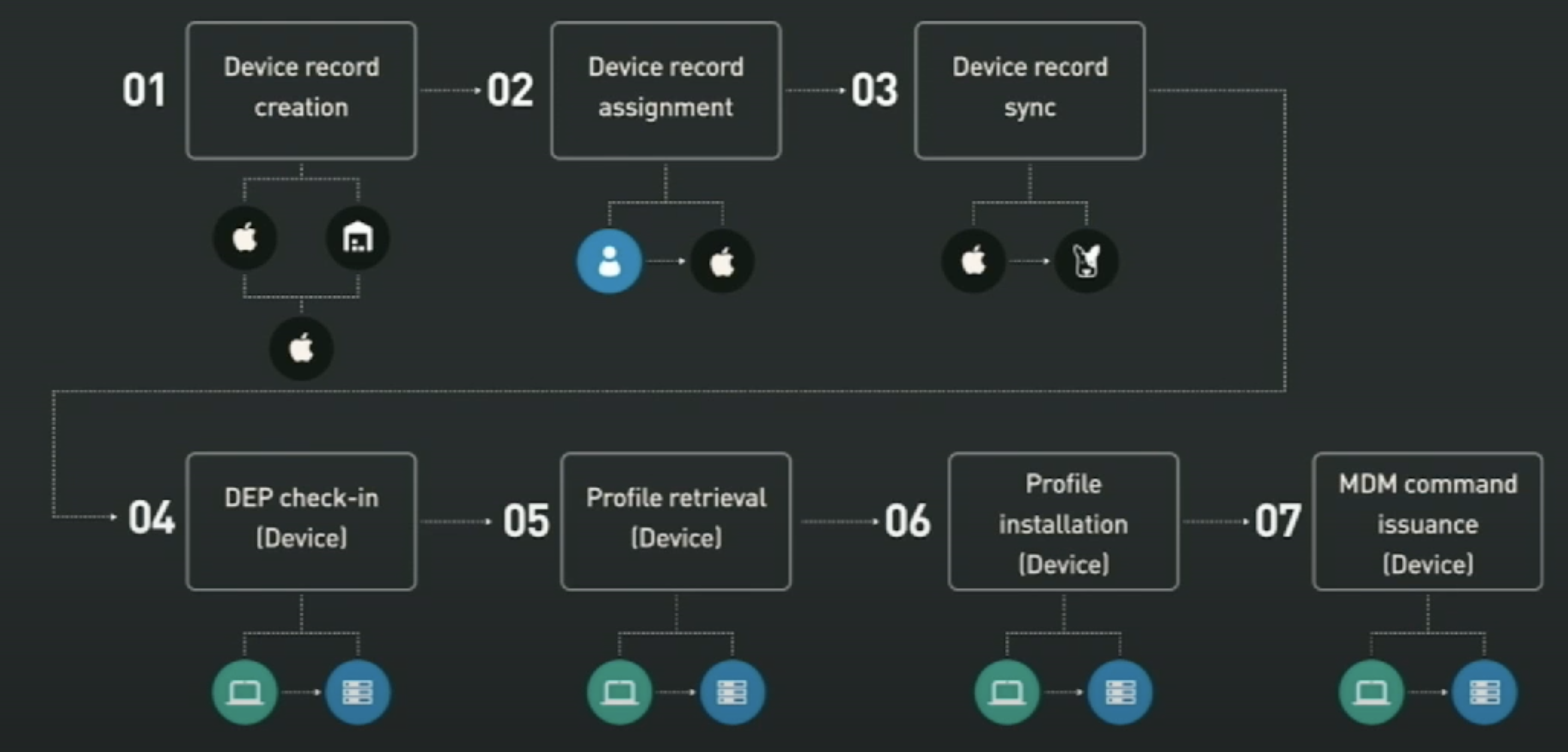 - Device record sync (MDM vendor): MDM sync the device records and push the DEP profiles to Apple
