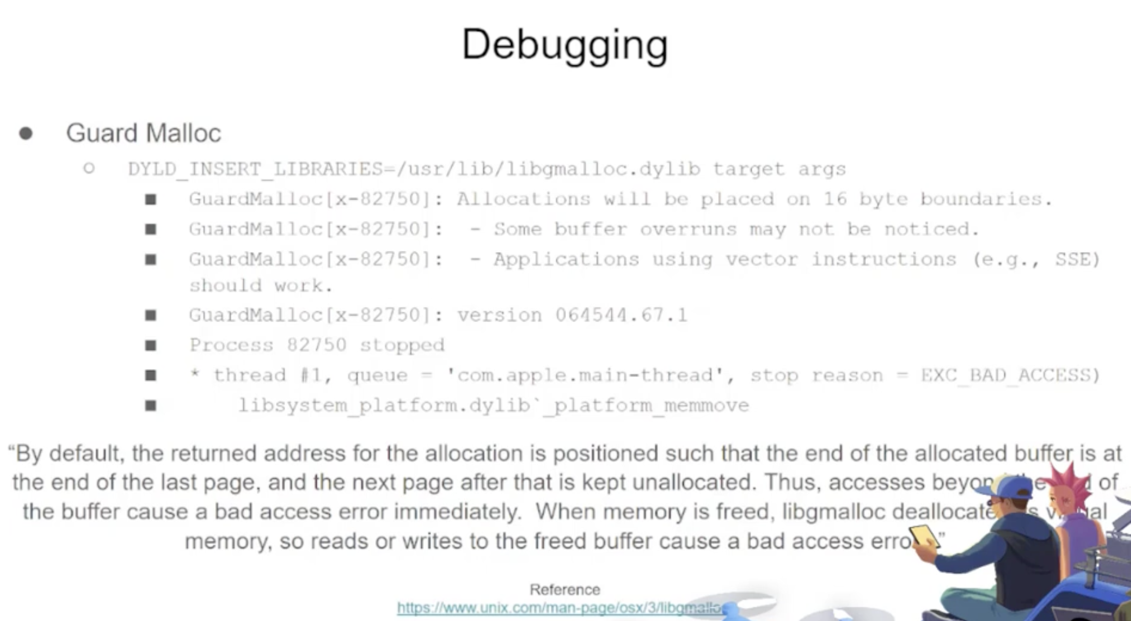lldb -o "target create `which some-binary`" -o "settings set target.env-vars DYLD_INSERT_LIBRARIES=/usr/lib/libgmalloc.dylib" -o "run arg1 arg2" -o "bt" -o "reg read" -o "dis -s \$pc-32 -c 24 -m -F intel" -o "quit"