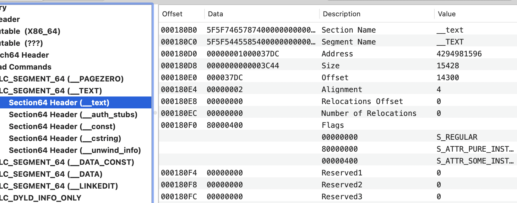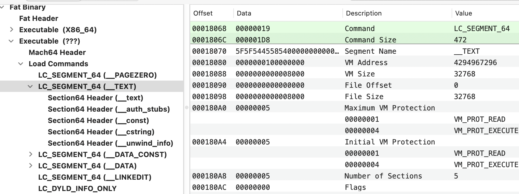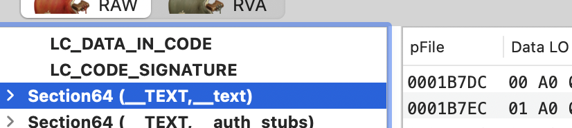 __TEXT: Contains executable code with read and execute permissions (no writable). Common sections of this segment:__text: Compiled binary code__const: Constant data (read only)__[c/u/os_log]string: C, Unicode or os logs string constants__stubsand__stubs_helper: Involved during the dynamic library loading process__unwind_info: Stack unwind data.- Note that all this content is signed but also marked as executable (creating more options for exploitation of sections that doesn't necessarily need this privilege, like string dedicated sections).