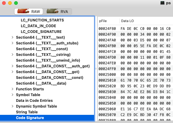 The magic header of the Code Signature is 0xFADE0CC0. Then you have information such as the length and the number of blobs of the superBlob that contains them.