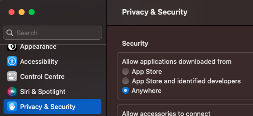 Starting in macOS 15 Sequoia, end users can no longer toggle Gatekeeper policy from spctl. Management is performed via System Settings or by deploying an MDM configuration profile with the com.apple.systempolicy.control payload. Example profile snippet to allow App Store and identified developers (but not "Anywhere"):