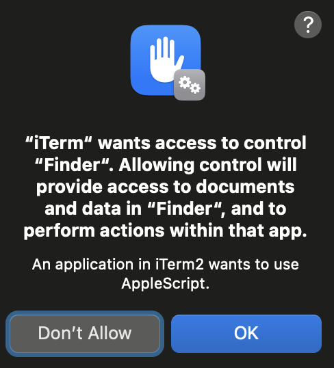 # Once inside the shell you can use the previous code to make Finder copy the TCC databases for example and not TCC prompt will appear