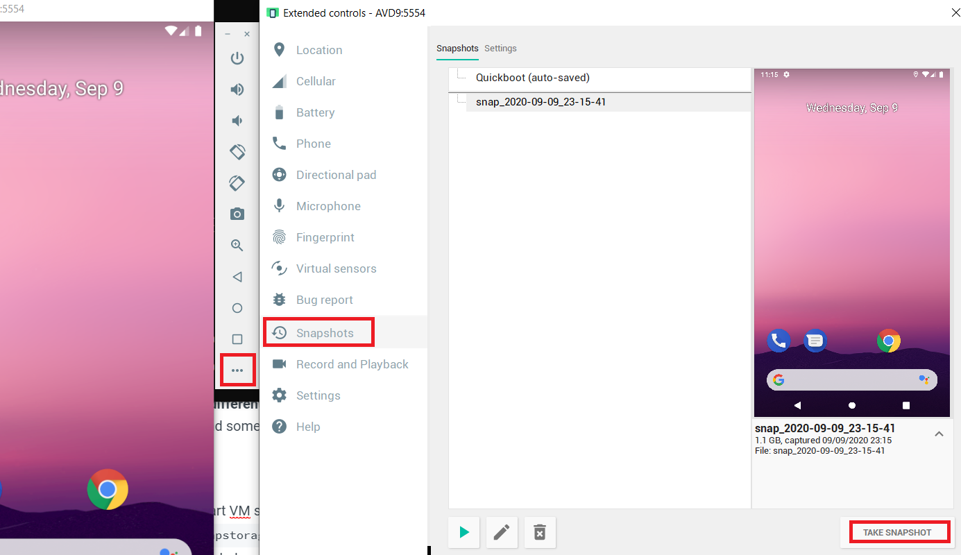 -snapshot name: Start VM snapshot-snapshot-list -snapstorage ~/.android/avd/Nexus_5X_API_23.avd/snapshots-test.img: List all the snapshots recorded