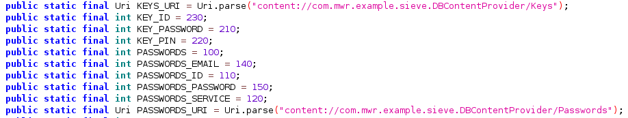 Authority: com.mwr.example.sieve.DBContentProvider