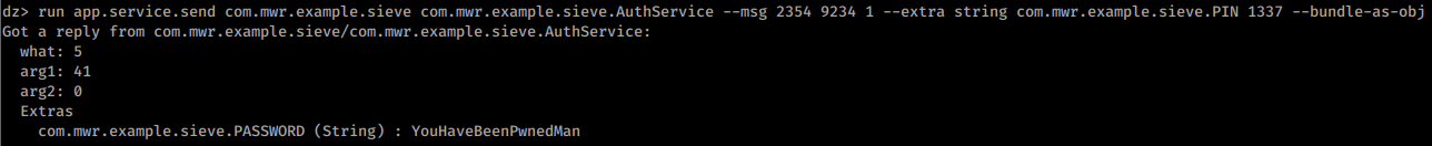 what == 2354arg1 == 9234arg2 == 1replyTo == object(string com.mwr.example.sieve.PIN 1337)