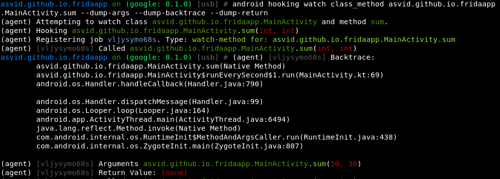 android hooking watch class_method asvid.github.io.fridaapp.MainActivity.sum --dump-args --dump-backtrace --dump-return