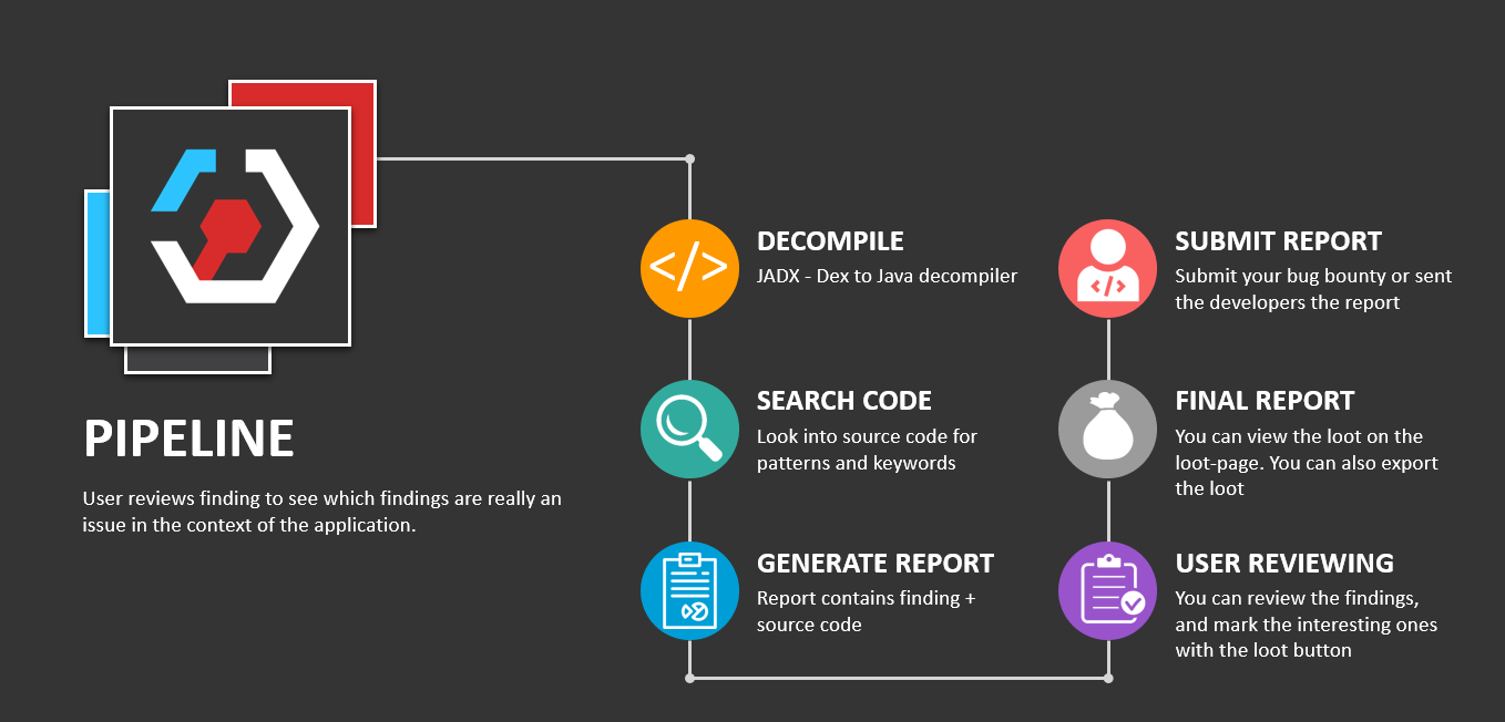 The concept is that you drag and drop your mobile application file (an .apk or .ipa file) on the StaCoAn application and it will generate a visual and portable report for you. You can tweak the settings and wordlists to get a customized experience.