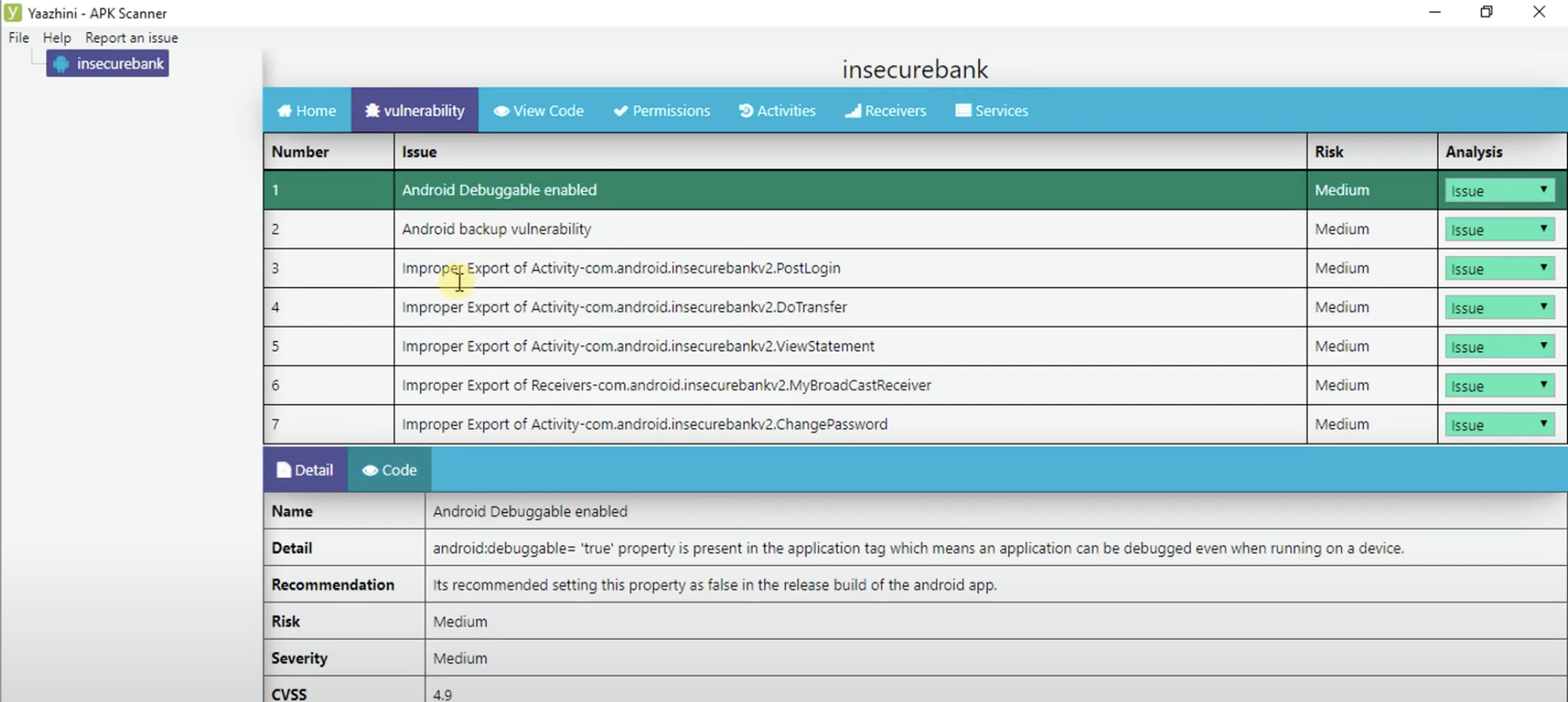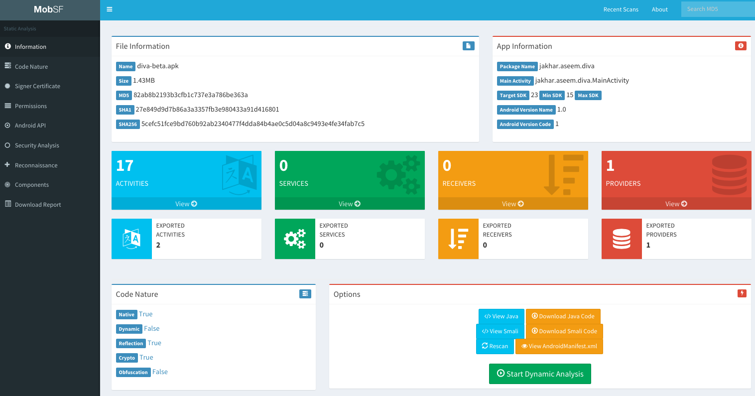 SUPER is a command-line application that can be used in Windows, MacOS X and Linux, that analyzes .apk files in search for vulnerabilities. It does this by decompressing APKs and applying a series of rules to detect those vulnerabilities.