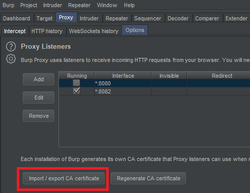 First of all you need to download the Der certificate from Burp. You can do this in Proxy --> Options --> Import / Export CA certificate