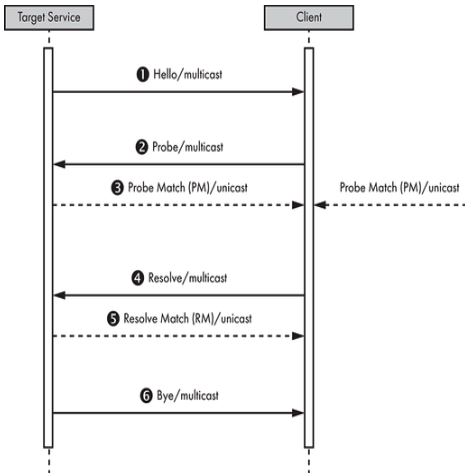 Upon joining a network, a Target Service announces its presence by broadcasting a multicast Hello. It remains open to receiving multicast Probes from Clients that are on the lookout for services by Type, an identifier unique to the endpoint (e.g., NetworkVideoTransmitter for an IP camera). In response to a matching Probe, a Target Service may send a unicast Probe Match. Similarly, a Target Service could receive a multicast Resolve aimed at identifying a service by name, to which it may reply with a unicast Resolve Match if it is the intended target. In the event of leaving the network, a Target Service attempts to broadcast a multicast Bye, signaling its departure.