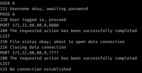 LIST(this will just send to the connected <IP:Port> the list of current files in the FTP folder) and check for the possible responses:150 File status okay(This means the port is open) or425 No connection established(This means the port is closed)- Instead of