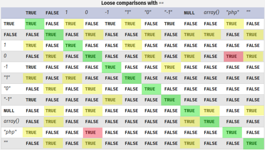"string" == 0 -> TrueA string which doesn't start with a number is equals to a number"0xAAAA" == "43690" -> TrueStrings composed by numbers in dec or hex format can be compare to other numbers/strings with True as result if the numbers were the same (numbers in a string are interpreted as numbers)"0e3264578" == 0 --> TrueA string starting with "0e" and followed by anything will be equals to 0"0X3264578" == 0X --> TrueA string starting with "0" and followed by any letter (X can be any letter) and followed by anything will be equals to 0"0e12334" == "0" --> TrueThis is very interesting because in some cases you can control the string input of "0" and some content that is being hashed and compared to it. Therefore, if you can provide a value that will create a hash starting with "0e" and without any letter, you could bypass the comparison. You can find already hashed strings with this format here: https://github.com/spaze/hashes"X" == 0 --> TrueAny letter in a string is equals to int 0