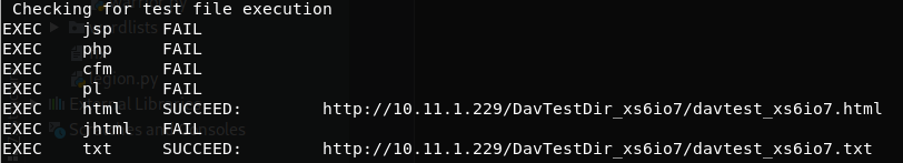 Davtest try to upload several files with different extensions and check if the extension is executed: