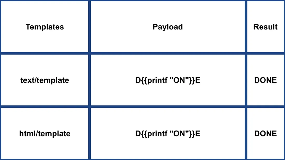 {{ . }}: Reveals the data structure input. For instance, if an object with aPasswordattribute is passed,{{ .Password }}could expose it.{{printf "%s" "ssti" }}: Expected to display the string "ssti".{{html "ssti"}},{{js "ssti"}}: These payloads should return "ssti" without appending "html" or "js". Further directives can be explored in the Go documentation here.