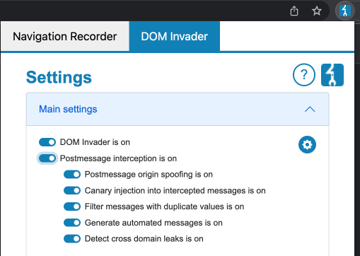 • Auto-fuzz: enable Postmessage interception ➜ Auto-mutate in settings to let DOM Invader generate canary-based payloads and replay them to the handler.