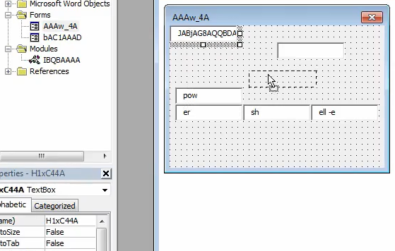 Using the GetObject function it's possible to obtain data from forms of the macro. This can be used to difficult the analysis. The following is a photo of a macro form used to hide data inside text boxes (a text box can be hiding other text boxes):