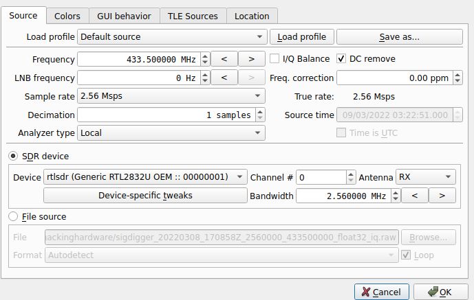 In settings (the second tab button) you can select the SDR device or select a file to read and which frequency to syntonise and the Sample rate (recommended to up to 2.56Msps if your PC support it)
