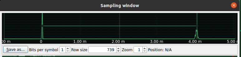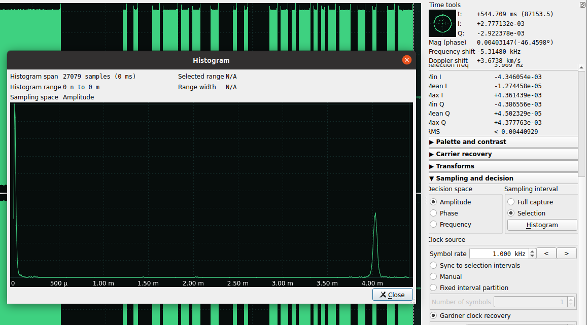 Having found this is an AM modulated signal and the symbol rate (and knowing that in this case something up means 1 and something down means 0), it's very easy to obtain the bits encoded in the signal. So, select the signal with info and configure the sampling and decision and press sample (check that Amplitude is selected, the discovered Symbol rate is configured and the Gadner clock recovery is selected):