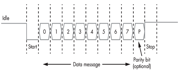 Generally, the line is held high (at a logical 1 value) while UART is in the idle state. Then, to signal the start of a data transfer, the transmitter sends a start bit to the receiver, during which the signal is held low (at a logical 0 value). Next, the transmitter sends five to eight data bits containing the actual message, followed by an optional parity bit and one or two stop bits (with a logical 1 value), depending on the configuration. The parity bit, used for error checking, is rarely seen in practice. The stop bit (or bits) signify the end of transmission.