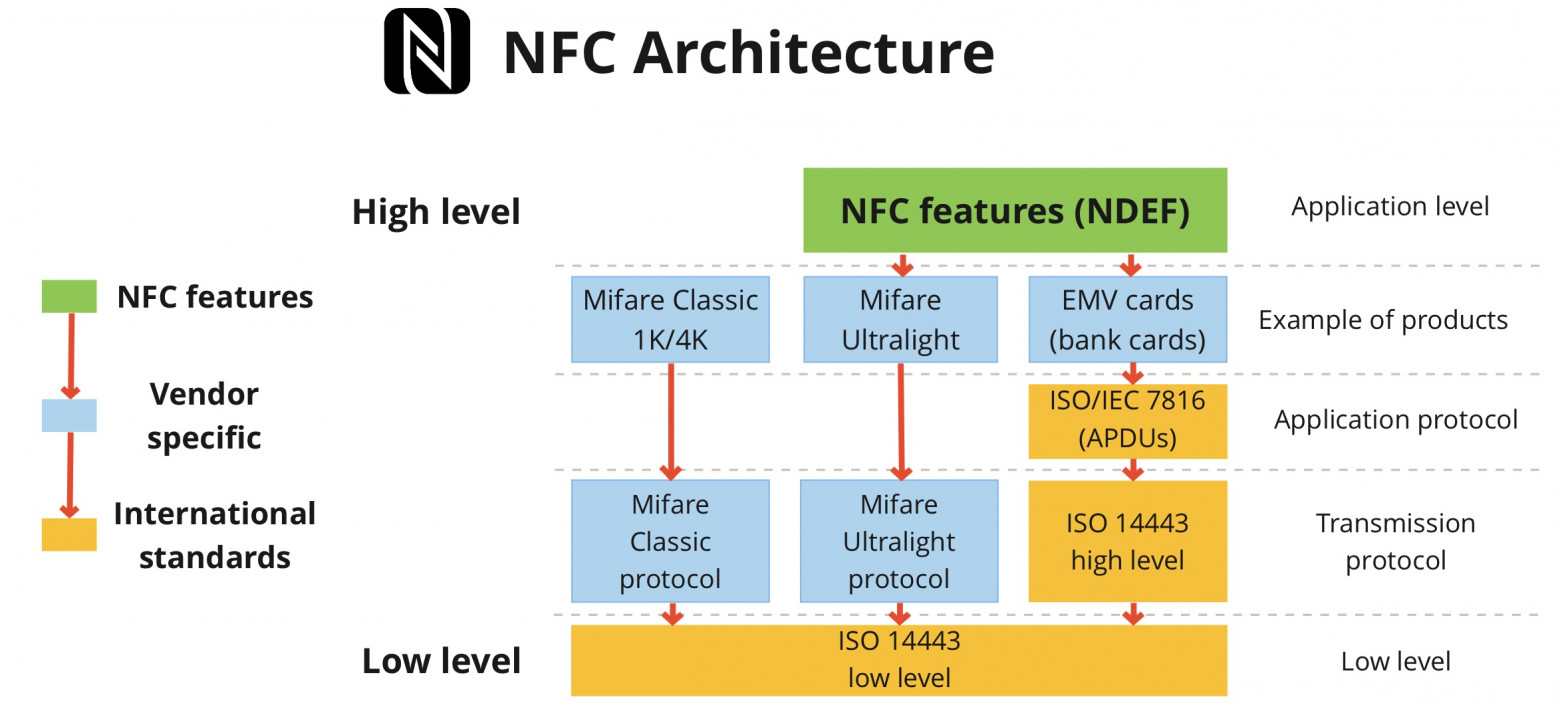To put it simply, NFC's architecture works like this: the transmission protocol is chosen by the company making the cards and implemented based on the low-level ISO 14443. For example, NXP invented its own high-level transmission protocol called Mifare. But on the lower level, Mifare cards are based on ISO 14443-A standard.