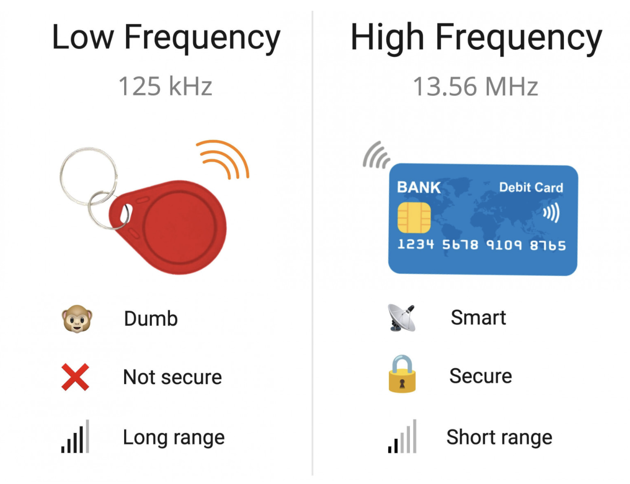 Low-frequency tags are often used in systems that do not require high security: building access, intercom keys, gym membership cards, etc. Due to their higher range, they are convenient to use for paid car parking: the driver does not need to bring the card close to the reader, as it is triggered from further away. At the same time, low-frequency tags are very primitive, they have a low data transfer rate. For that reason, it's impossible to implement complex two-way data transfer for such things as keeping balance and cryptography. Low-frequency tags only transmit their short ID without any means of authentication.