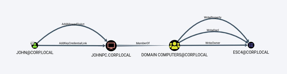 As we can see in the path above, only JOHNPC has these privileges, but our user JOHN has the new AddKeyCredentialLink edge to JOHNPC. Since this technique is related to certificates, I have implemented this attack as well, which is known as Shadow Credentials. Hereâs a little sneak peak of Certipyâs shadow auto command to retrieve the NT hash of the victim.