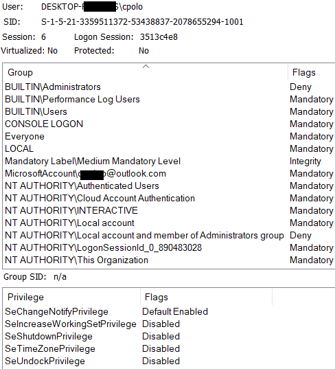 MicrosoftAccount\cpolop@outlook.com User S-1-11-96-3623454863-58364-18864-2661722203-1597581903-3158937479-2778085403-3651782251-2842230462-2314292098 Mandatory group, Enabled by default, Enabled group