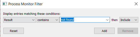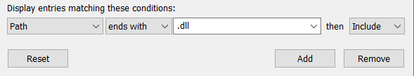 If you are looking for a missing dll inside an specific executable you should set another filter like "Process Name" "contains" "<exec name>", execute it, and stop capturing events.