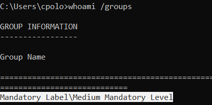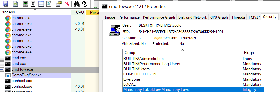Now, when I run cmd-low.exe it will run under a low-integrity level instead of a medium one: