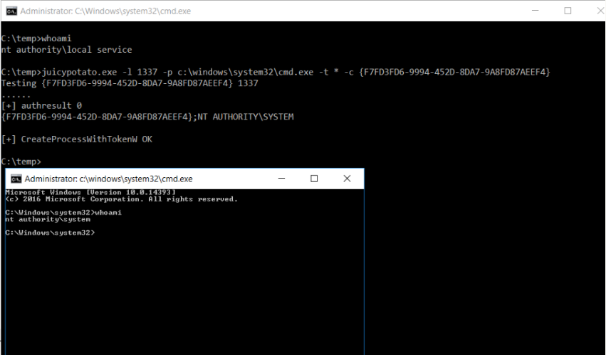 A sugared version of RottenPotatoNG, with a bit of juice, i.e. another Local Privilege Escalation tool, from a Windows Service Accounts to NT AUTHORITY\SYSTEM