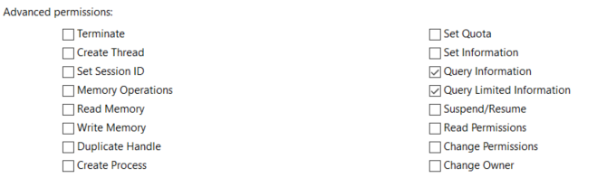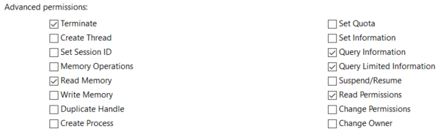 The previous image contains all the privileges that "Administrators" have over the selected process (as you can see in case of svchost.exe they only have "Query" privileges)